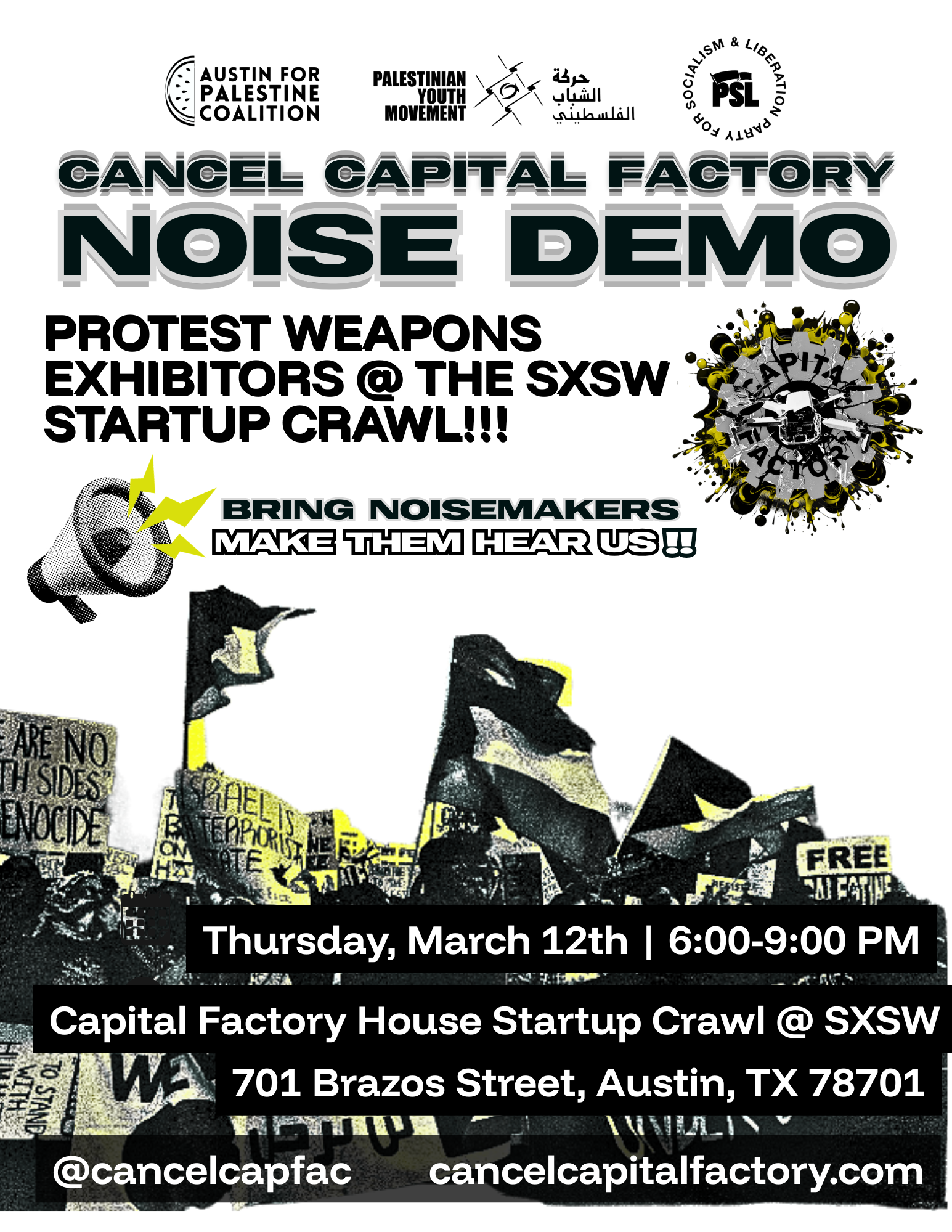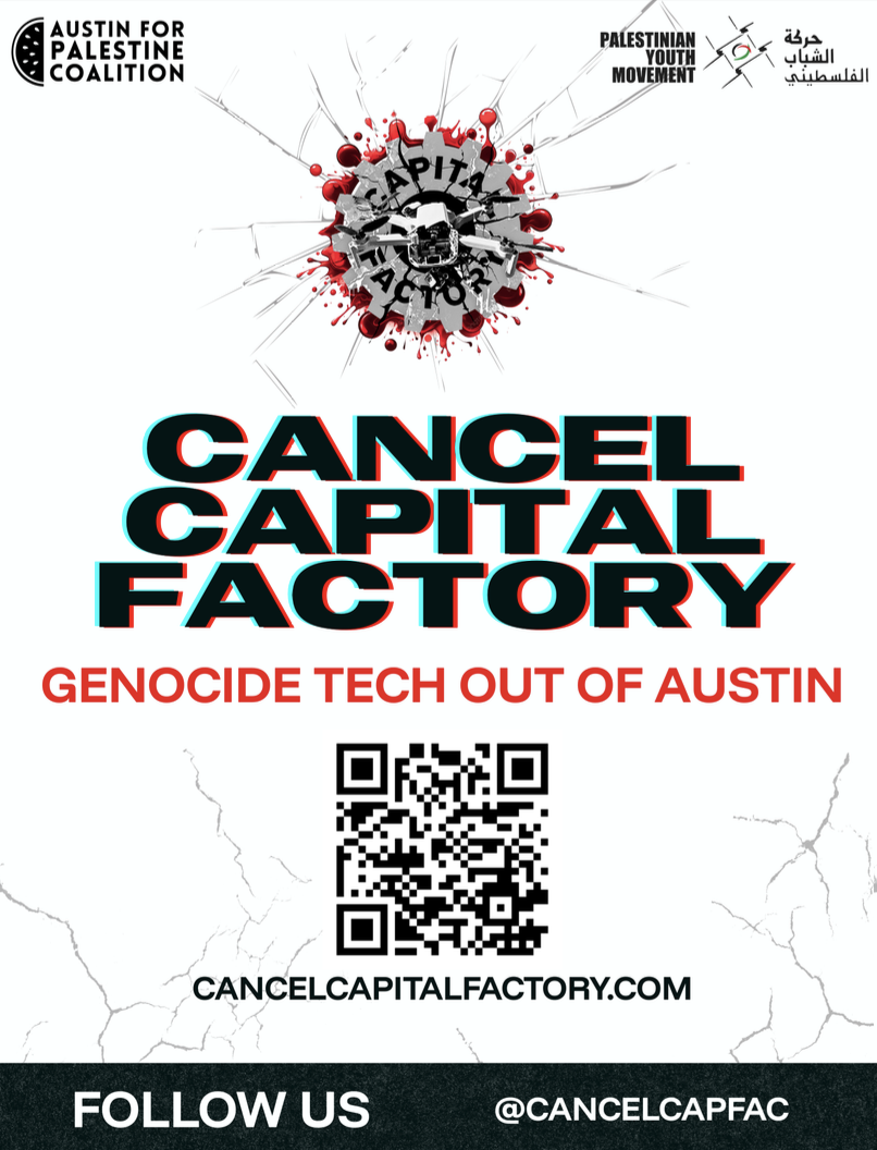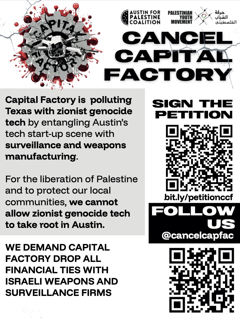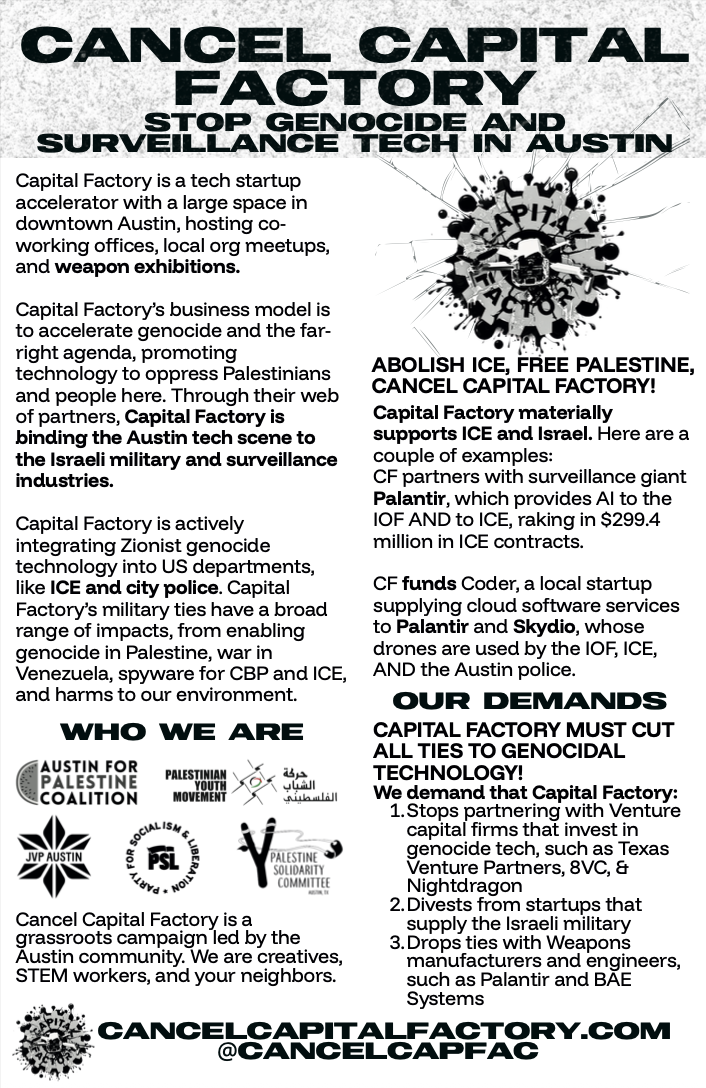 Thank you for doing what you can to expose Capital Factory’s deep connections to military, weapons, surveillance technology. Together we can kick genocide technology out of Austin!